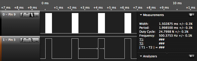 The sketch below is a variation on the frequency counter above. However this one measures the width of the "on" portion of the duty cycle of a pulse. This could be useful for decoding information from PWM style controls.